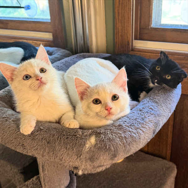 This crew has seen my small dogs (not interacted with them) and, so far, seems uninterested; I think they would do fine in a home with other pets with slow introductions. Kittens do best with a buddy – Camp Kitten requires kittens to be adopted in pairs if there isn’t already a young cat or kitten in the home.